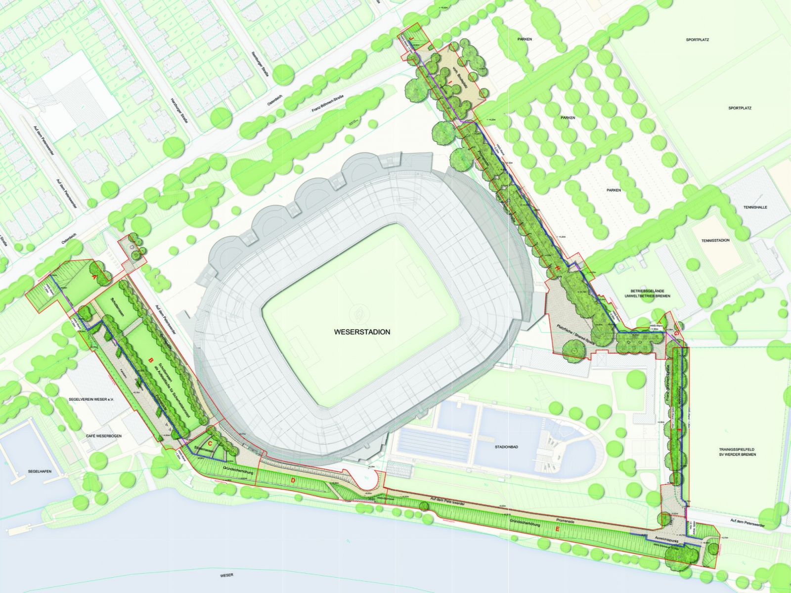 In Arbeitsgemeinschaft mit Wasserbautechnikern wurden für den Hochwasserschutzfall des Bremer Weser-Stadions Spundwände und Erdbaumaßnhamen bis zu einer Höhe von +6,50m NHN durchgeführt. Die umgebenden Freianlagen wurden als grüner Korridor in einem einheitlichen Konzept zum Hochwaseserschutz gestaltet. Somit dient die Freiraumplanung der Optimierung des konstruktiven Hochwasserschutzes. Durch die Entsiegelung von Flächen entstanden neue Grünräume mit einem hohen Naherholungsaspekt.