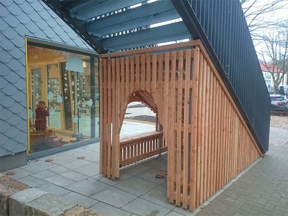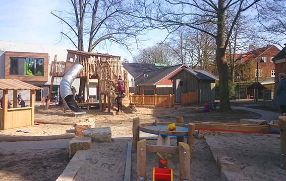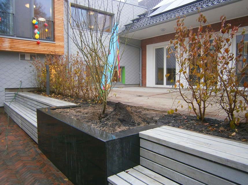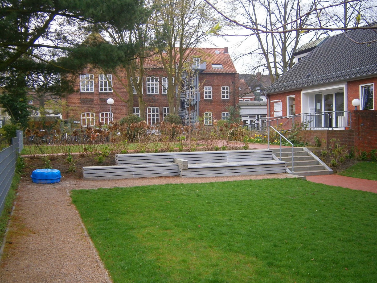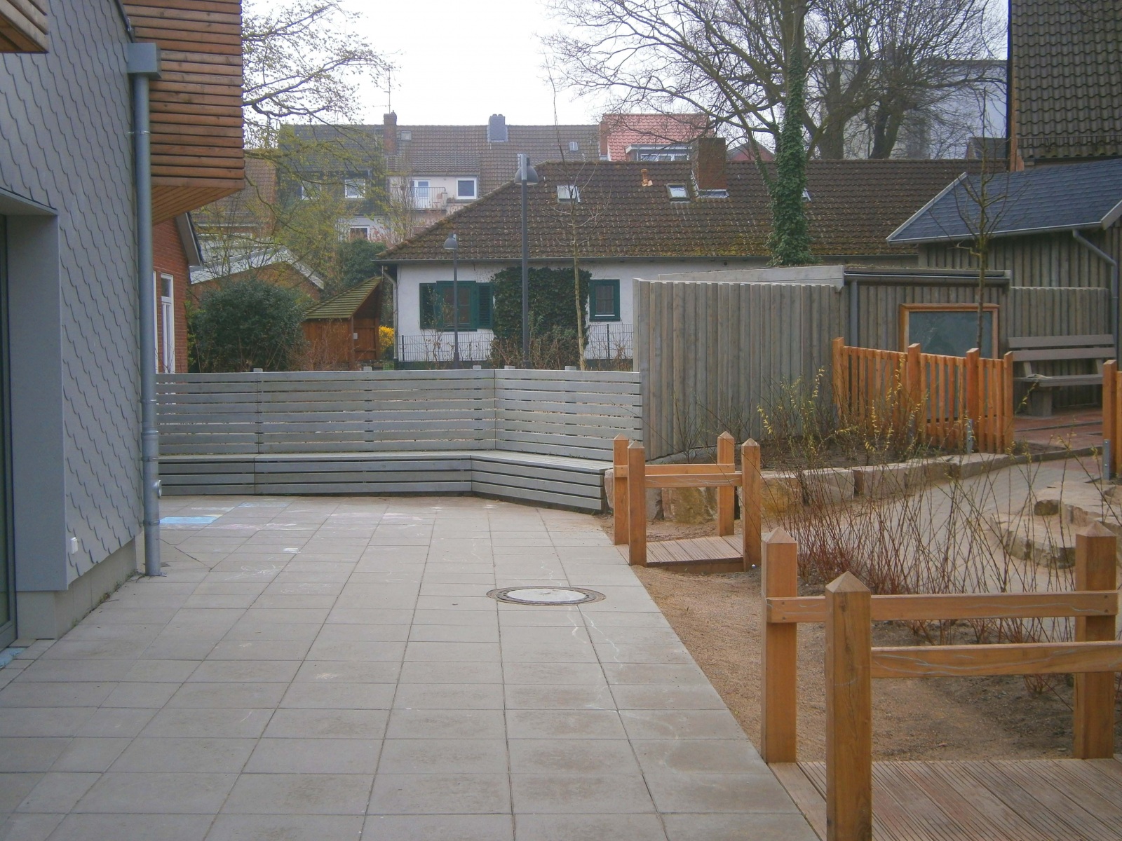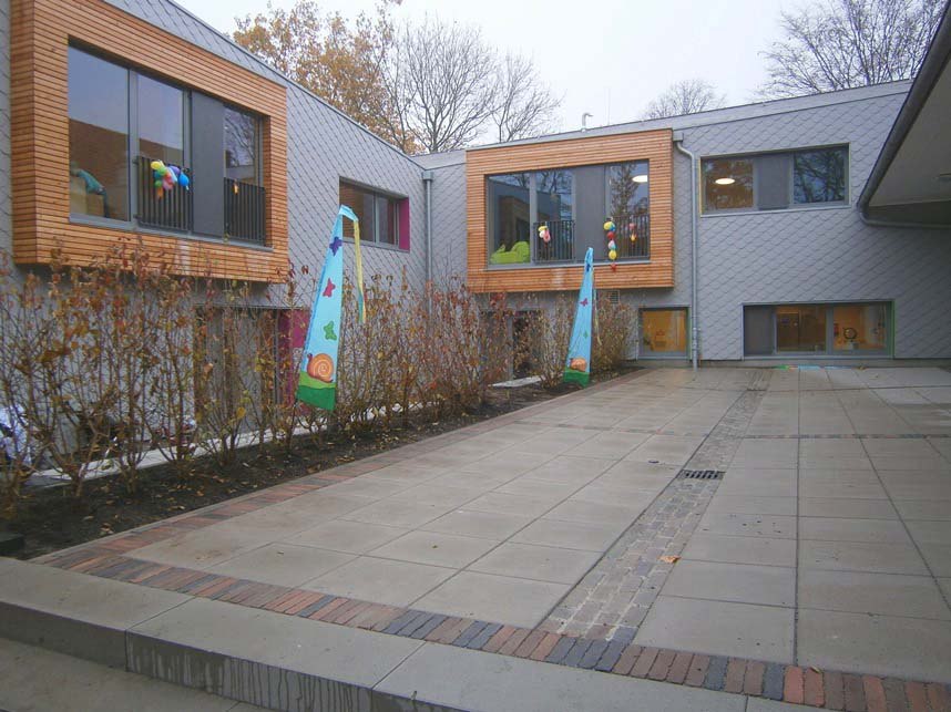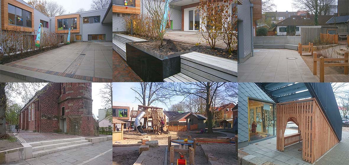 Vorangegangen war ein Wettbewerb (1. Preis) zusammen mit den Architekten Gräfe/Schonhoven, der die Ergänzung eines bestehenden Gemeindehauses mit einem Neubau der Kindertagesstätte beinhaltete. Die Außenanlagen beschäftigen sich mit der Verknüpfung des KiTa-Außengeländes und einem naturnahen Spielbereich sowie den Flächen der Gemeinde.